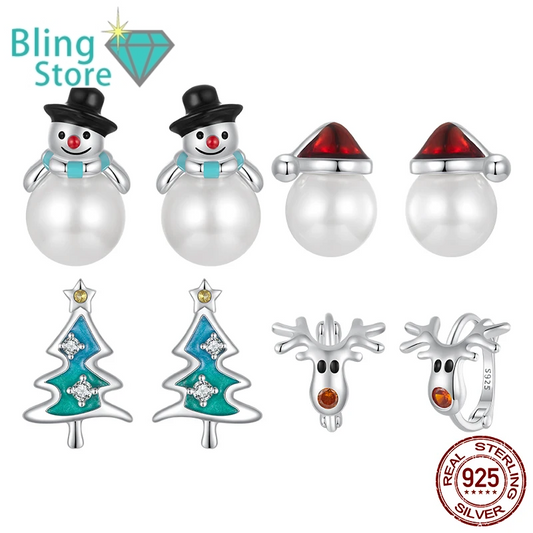 Zilveren Kerst oorbellen met parel, sneeuwpop, kerstboom en rendier