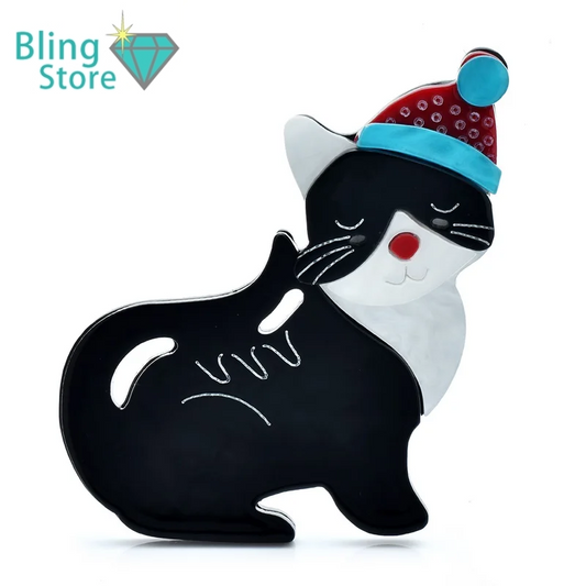 Kerst Broche Schattige Zwarte Kat met Kerstmuts