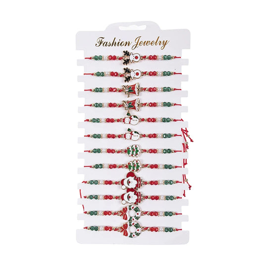 Kerst armbanden set 12 stuks met sneeuwvlok, rendier en kerstman bedels