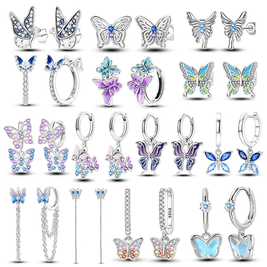 Zilveren oorbellen met blauwe vlinder en fonkelende zirkonia hanger