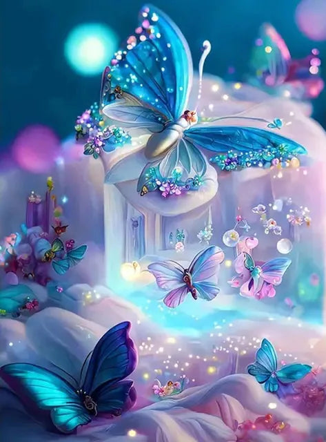 Laat je betoveren door deze AB Diamond Painting op canvas met een sprookjesachtig landschap vol magie en kleur. Deze schitterende afbeelding toont een dromerige sterrenhemel, een sierlijke boom en een fladderende vlinder, allemaal in een fantasierijke setting met subtiele rozentinten. De combinatie van zachte kleuren en fonkelende accenten maakt dit ontwerp een ware blikvanger.