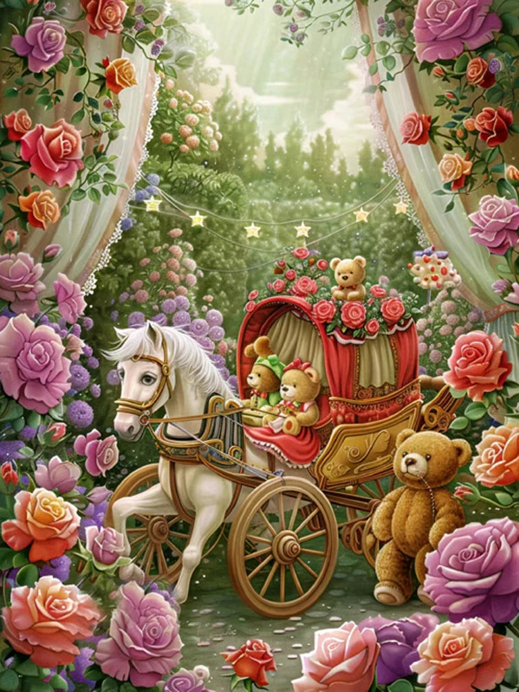 Betreed een sprookjesachtige wereld met deze AB Diamond Painting op canvas van een betoverende rozentuin. In het midden prijkt een elegante koets, omringd door bloeiende rozen en een schattige beer die waakt over het magische tafereel. Deze afbeelding zit vol dromerige details en zachte kleuren, perfect voor liefhebbers van fantasie en romantiek.
