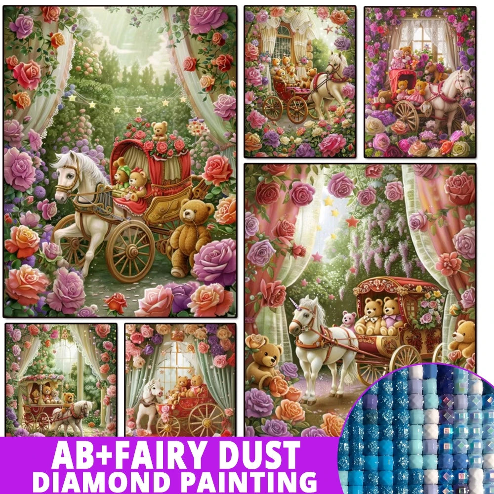 AB Diamond Painting op canvas – Fairy Dust Rozentuin met Koets en Beer