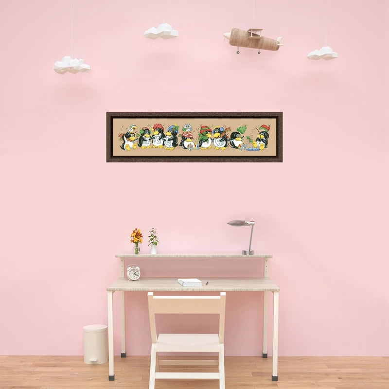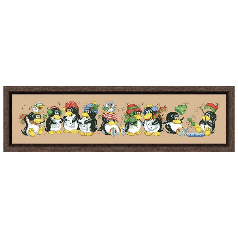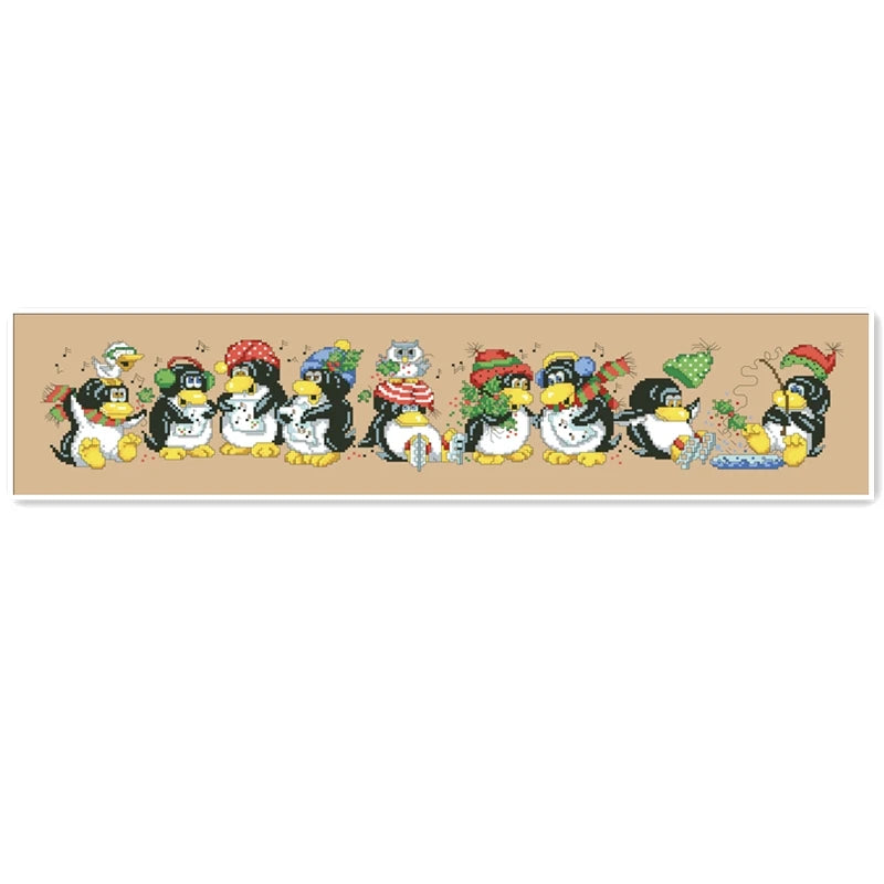 Borduurpakket Kerst pinguïn rij kruissteek set met linnen en katoendraad