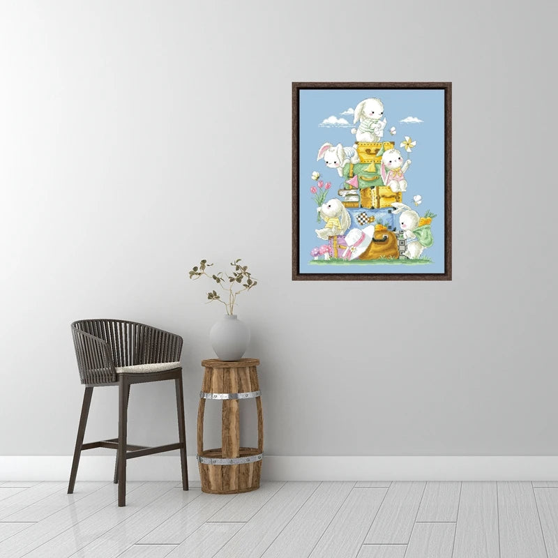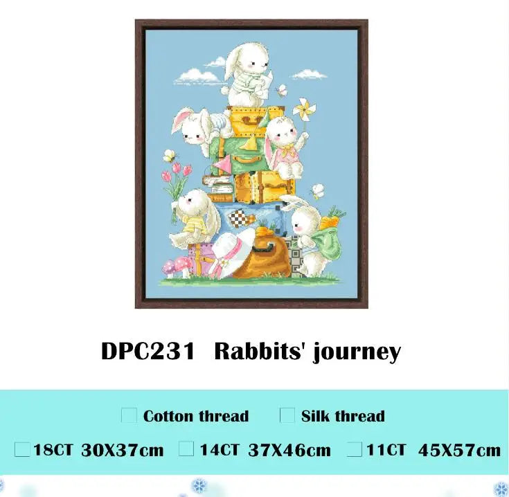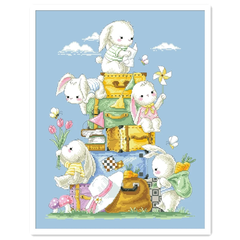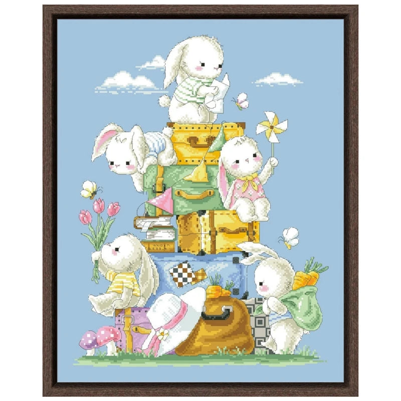 Ontdek het charmante borduurpakket met een hartverwarmende afbeelding van twee schattige konijntjes op reis. Dit pakket is perfect voor liefhebbers van handwerken die houden van fijne details en zachte kleuren. De luchtblauwe achtergrond brengt de figuurtjes tot leven en zorgt voor een rustgevende uitstraling tijdens het borduren.
