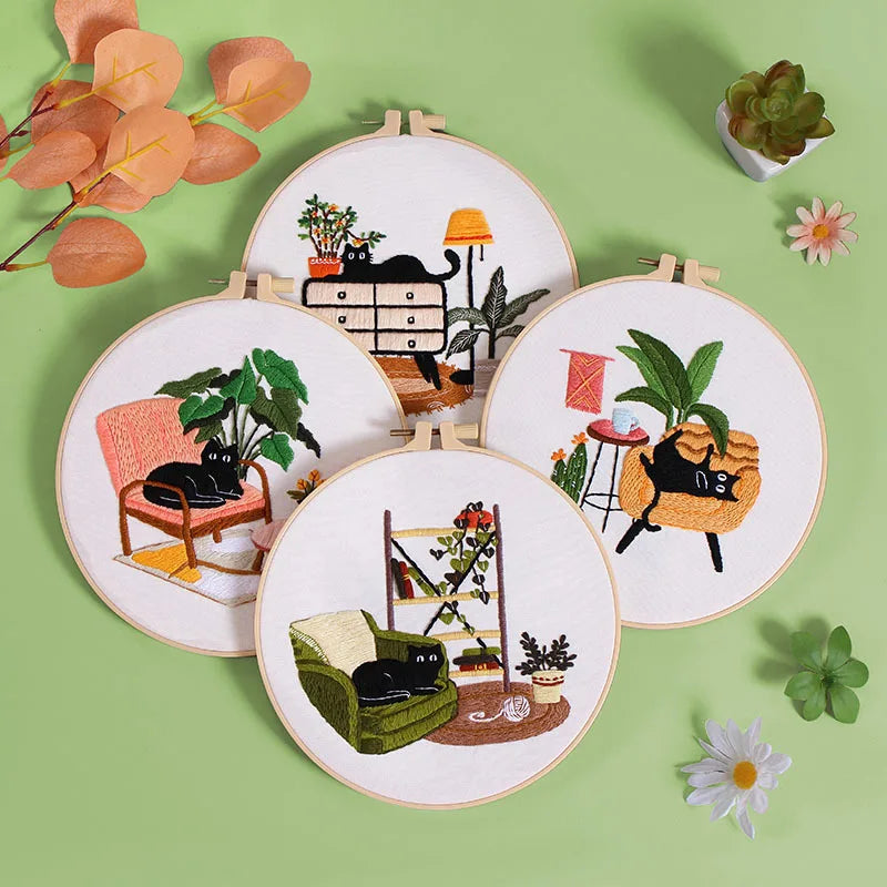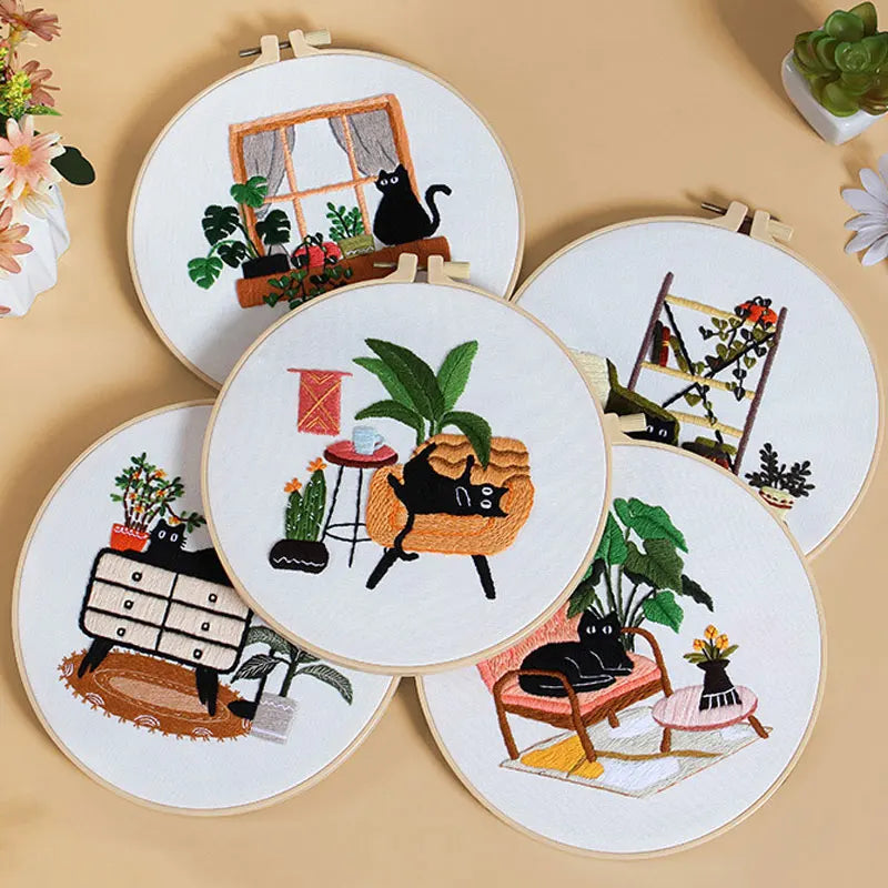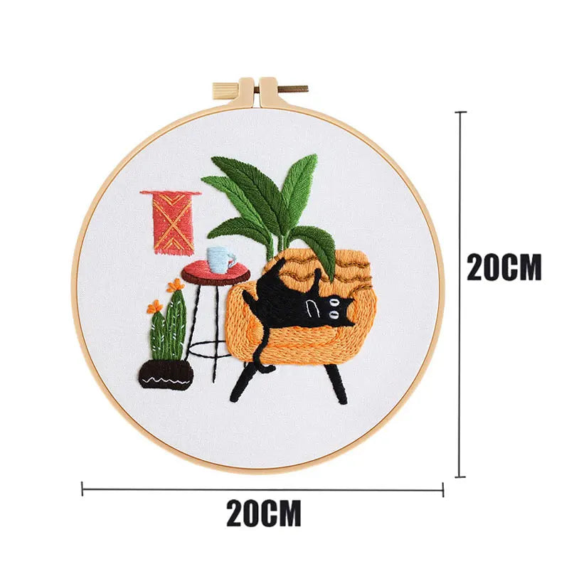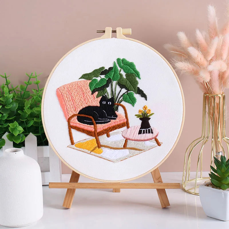 Het ontwerp bestaat uit een charmante combinatie van bloemen, planten en een speelse kat, waardoor het ideaal is voor zowel beginners als ervaren borduurders. Dankzij de duidelijke instructies en het vooraf geprinte patroon is dit een perfect project om de techniek van borduren onder de knie te krijgen. Na voltooiing kan het borduurwerk gewassen worden om de print te verwijderen en als decoratie worden gebruikt.