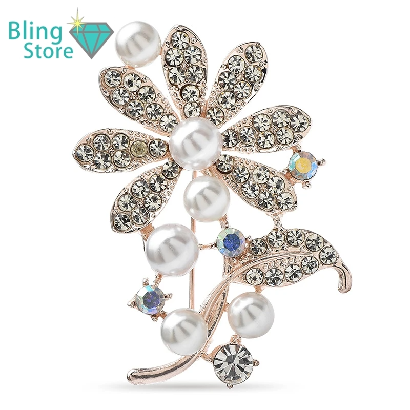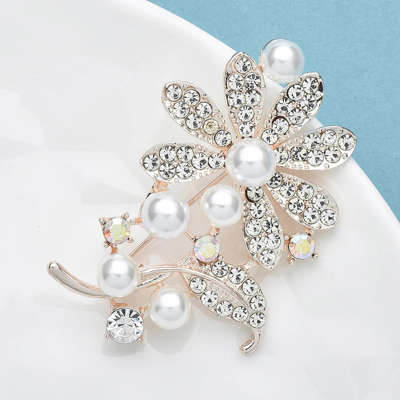 Deze elegante broche is geïnspireerd op de natuurlijke schoonheid van een bloem gecombineerd met een verfijnd bladmotief. De centrale parel wordt omringd door glinsterende kristallen die de vorm van een pluizige bloem suggereren. Deze unieke combinatie zorgt voor een charmante en vrouwelijke uitstraling.