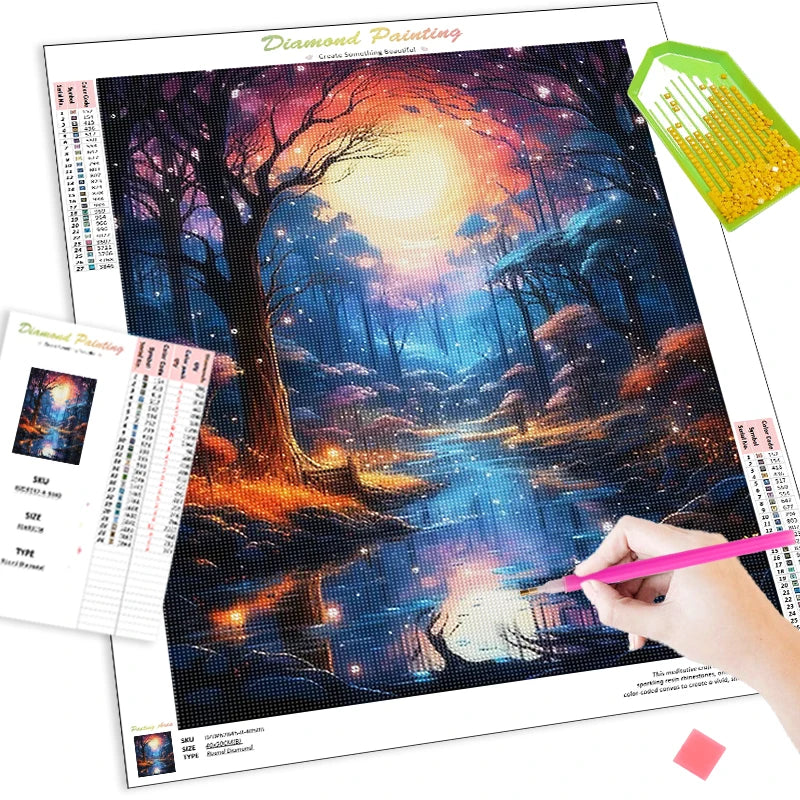 Breng rust en diepte in je interieur met dit prachtige diamond painting landschap. Het bosdecor komt tot leven door de sprankelende steentjes die samen een verfijnd en harmonieus geheel vormen. Het ontwerp is zorgvuldig opgebouwd zodat kleuren vloeiend in elkaar overlopen en het eindresultaat een luxe uitstraling heeft die direct de aandacht trekt.