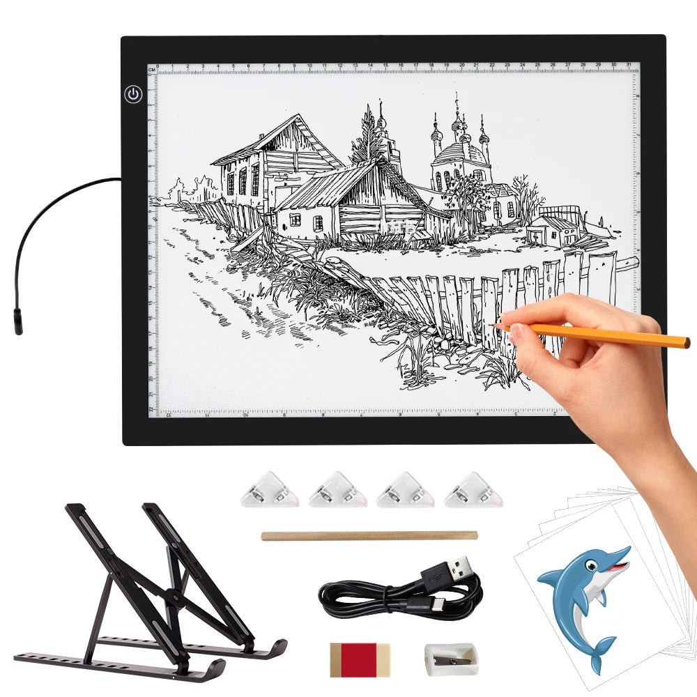 Complete Set: Inclusief A4 LED Lightpad, verstelbare standaard, 4 clips, Type-C kabel (1,8 m), potlood, puntenslijper, gum, 10 overtrekpapieren en handleiding – alles wat je nodig hebt om direct aan de slag te gaan.