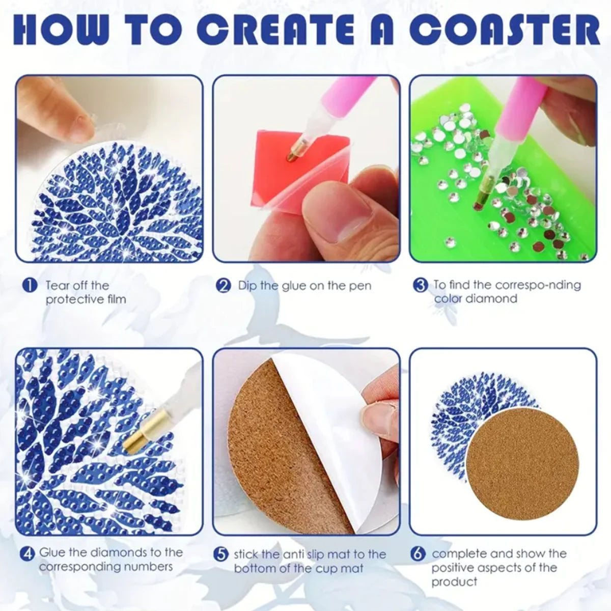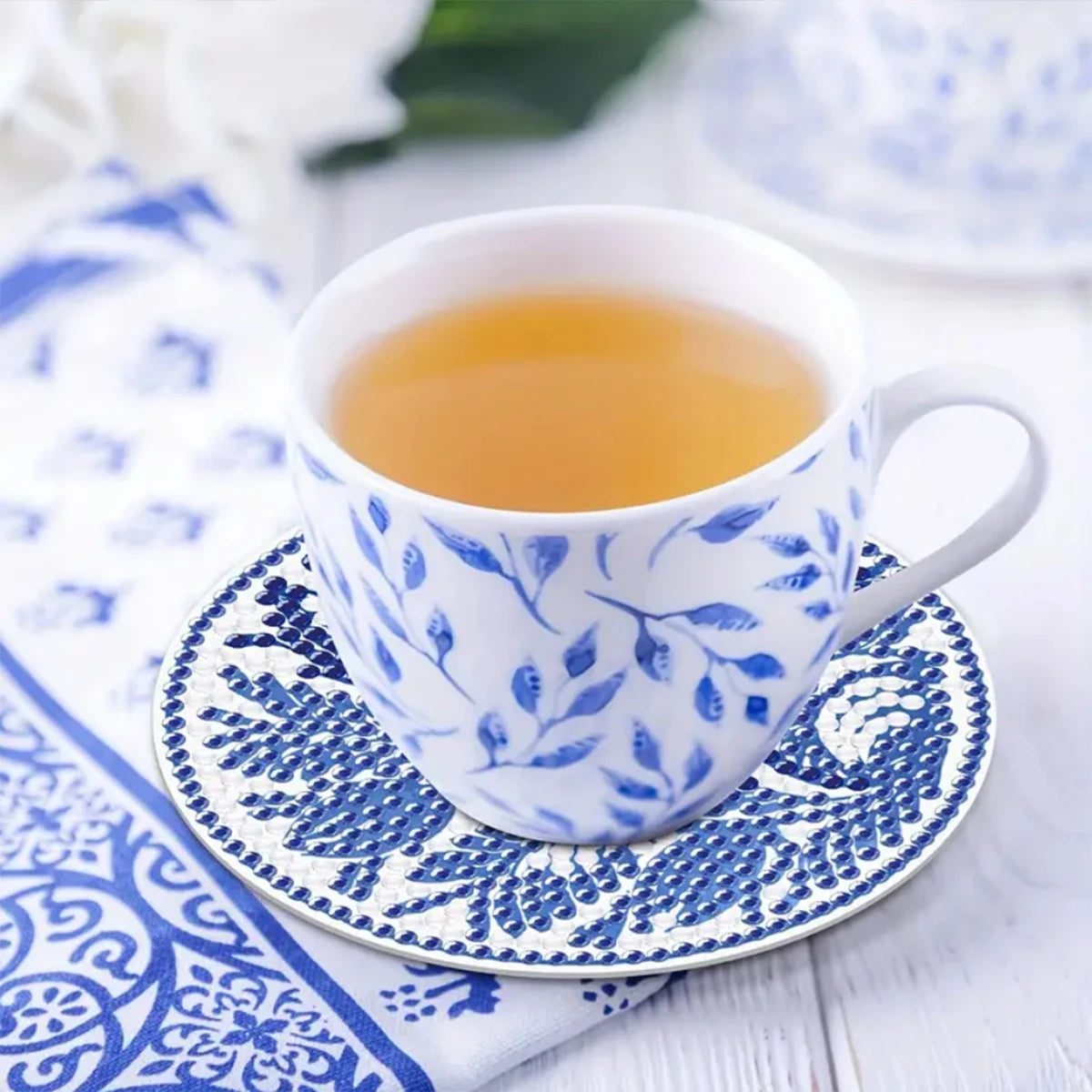 Diamond Painting Onderzetters - 8-delige Set met Blauw-Wit Porselein Patroon + houder