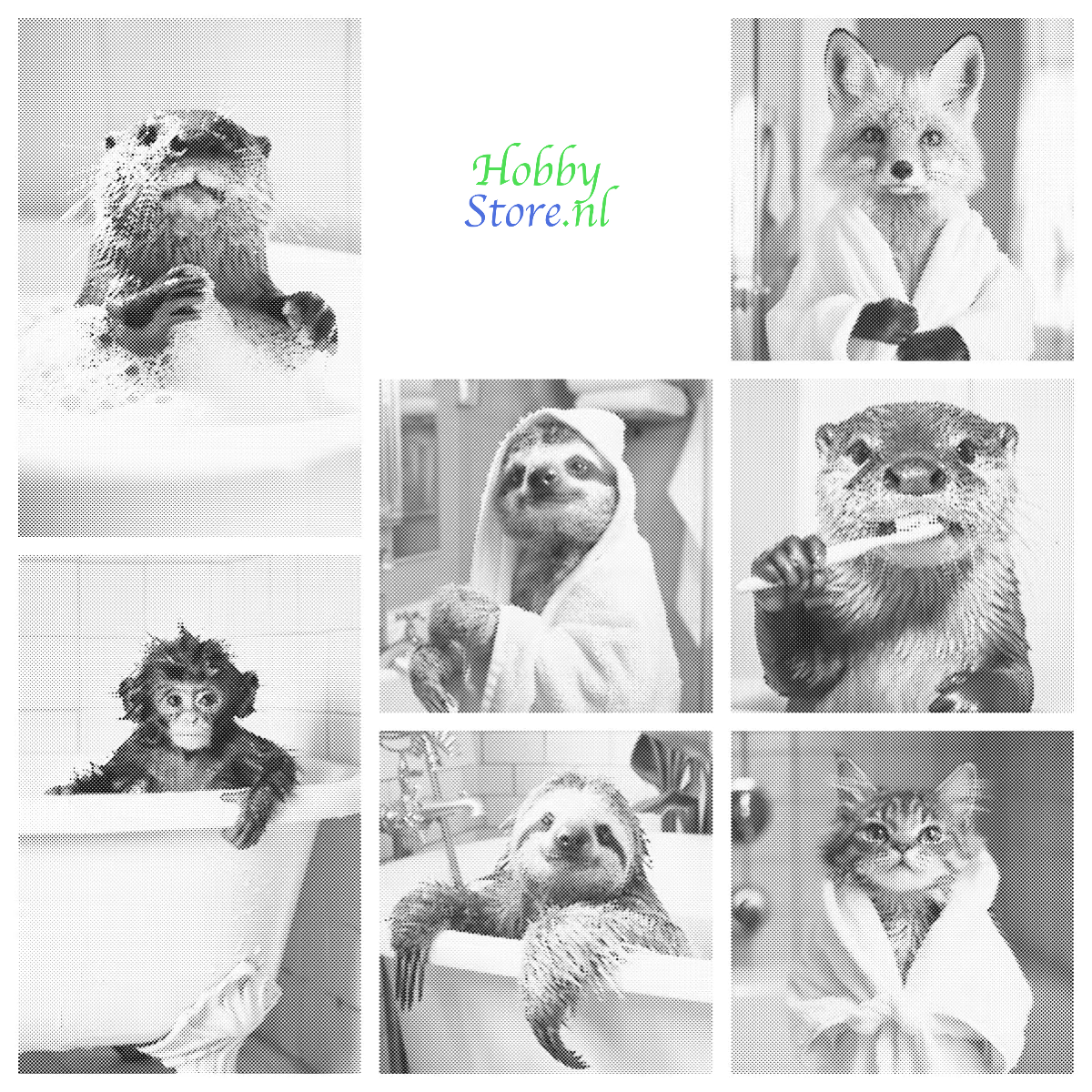 Breng een glimlach op je gezicht met deze vrolijke DOT Painting van dieren in bad. Of je nu kiest voor een kleine of grotere variant (40x60cm, 50x75cm of 60x90cm), dit kunstwerk zorgt voor ontspanning, focus én een prachtig eindresultaat.