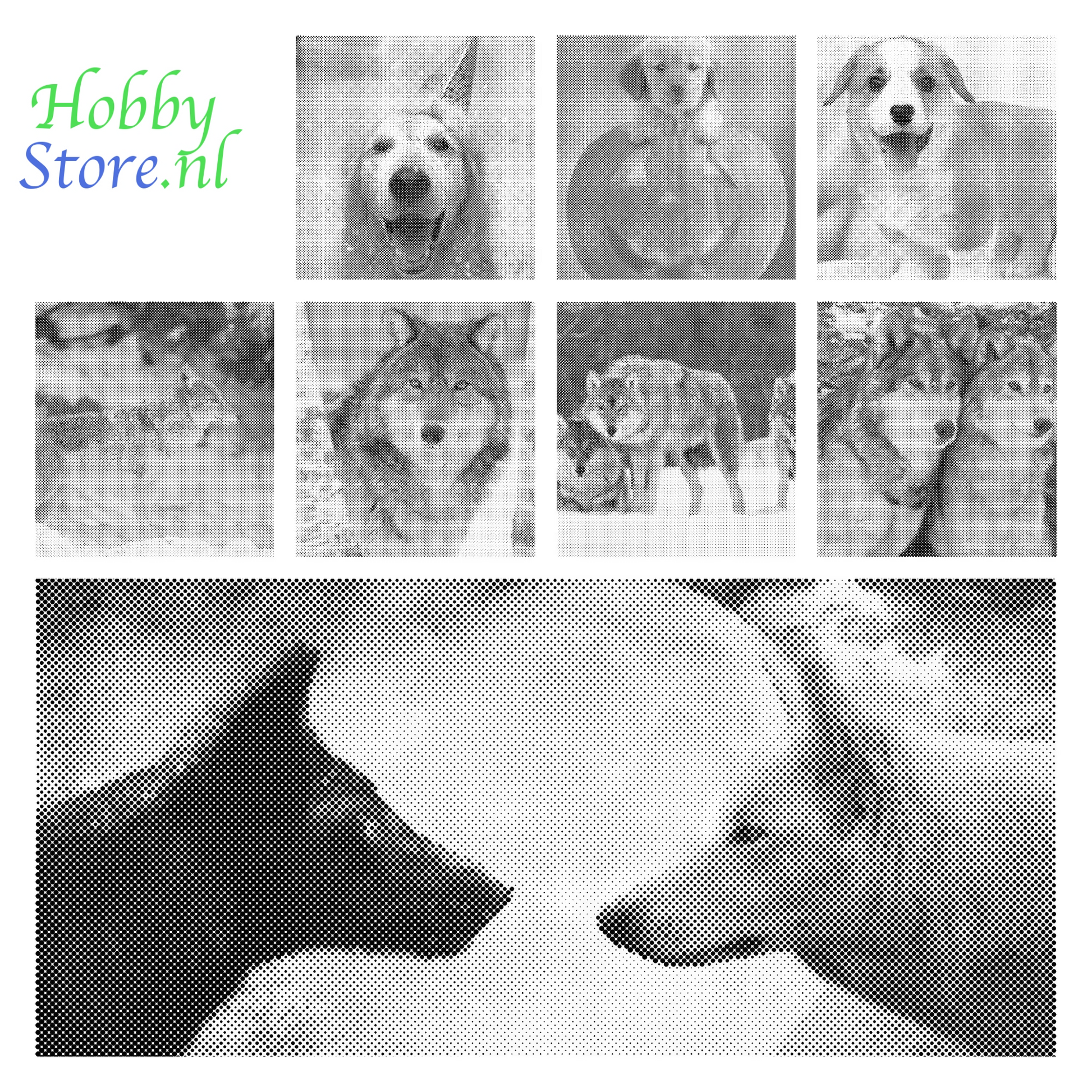 Maak kennis met de prachtige wereld van DOT Painting! Dit unieke product combineert ontspanning en creativiteit in een betoverende kunstvorm. Met dit pakket kunt u indrukwekkende afbeeldingen van wolven en honden creëren door stippen van verschillende formaten in te kleuren op een voorbedrukt canvas.