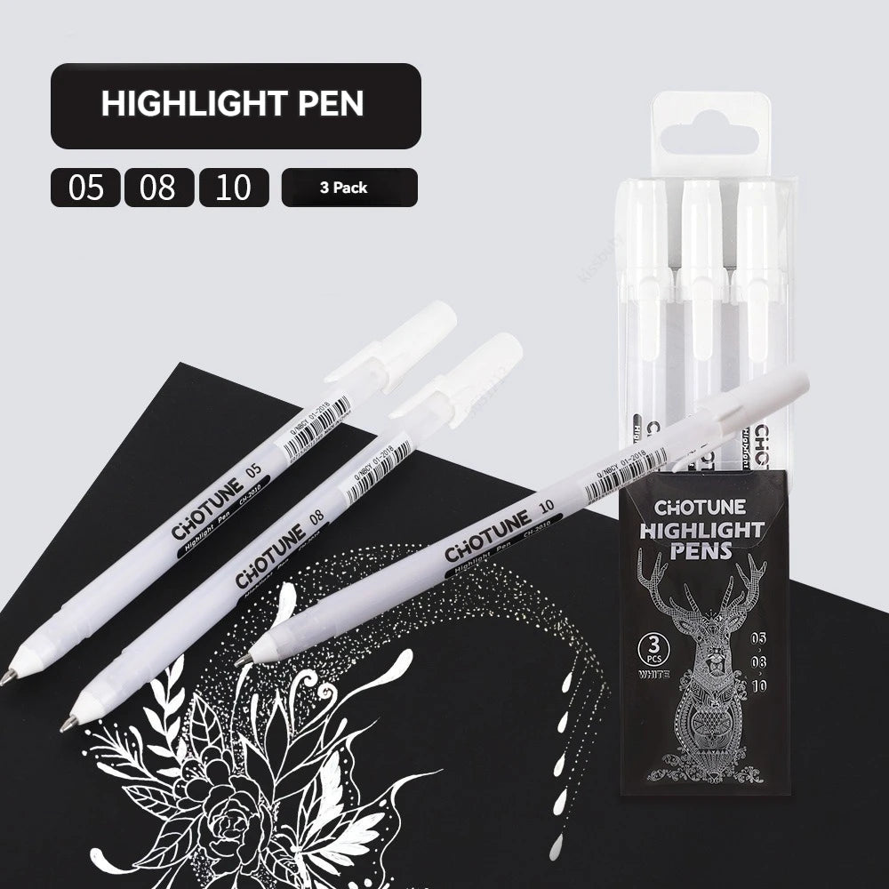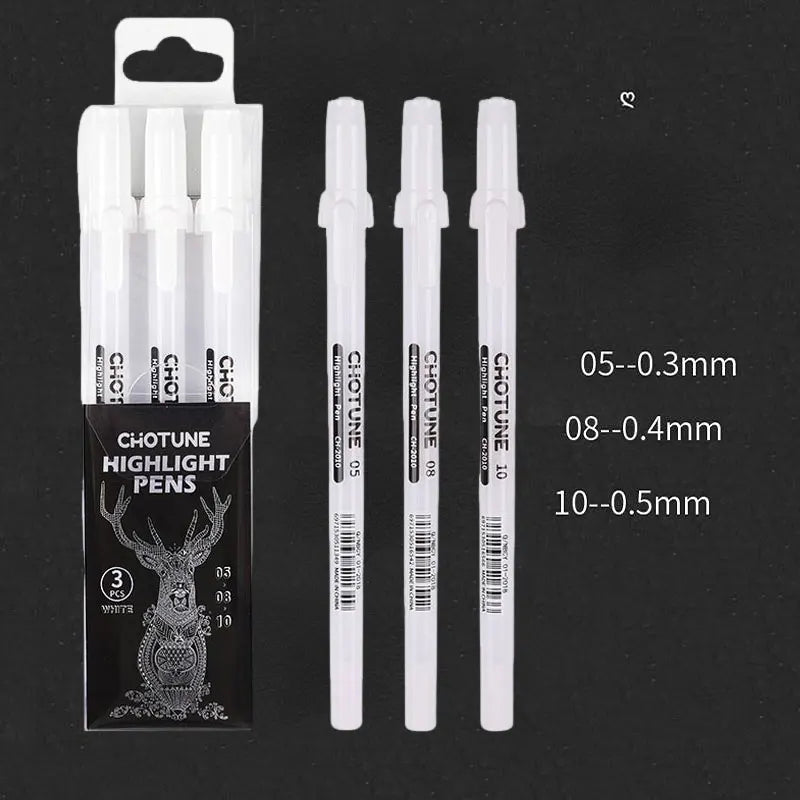 Breng je creativiteit tot leven met deze witte gelpen set, perfect voor tekenen, handlettering en journaling. De set bevat drie pennen met verschillende puntdiktes: fijn, medium en breed. De heldere, dekkende witte inkt zorgt voor scherpe accenten en mooie details op zowel licht als donker papier. Ideaal voor illustraties, schaduweffecten en het toevoegen van highlights aan je kunstwerken. Dankzij de soepele inkttoevoer en comfortabele grip werk je nauwkeurig en moeiteloos. Een onmisbare toevoeging aan je creatieve collectie.