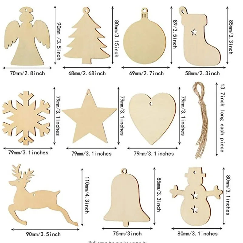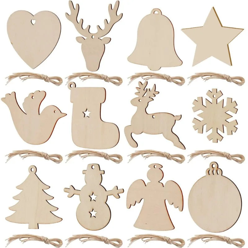 Houten figuur om zelf te kleuren/schilderen – 10 kerstornamenten rendier, engel, hart, bel en ster