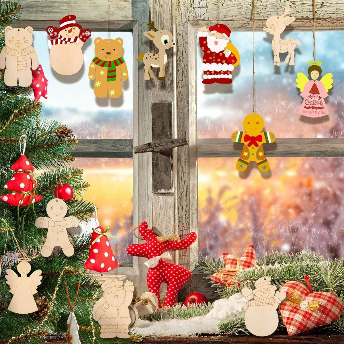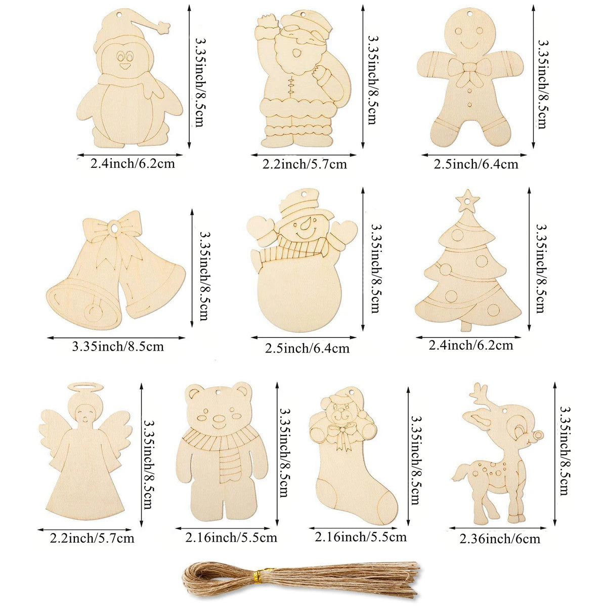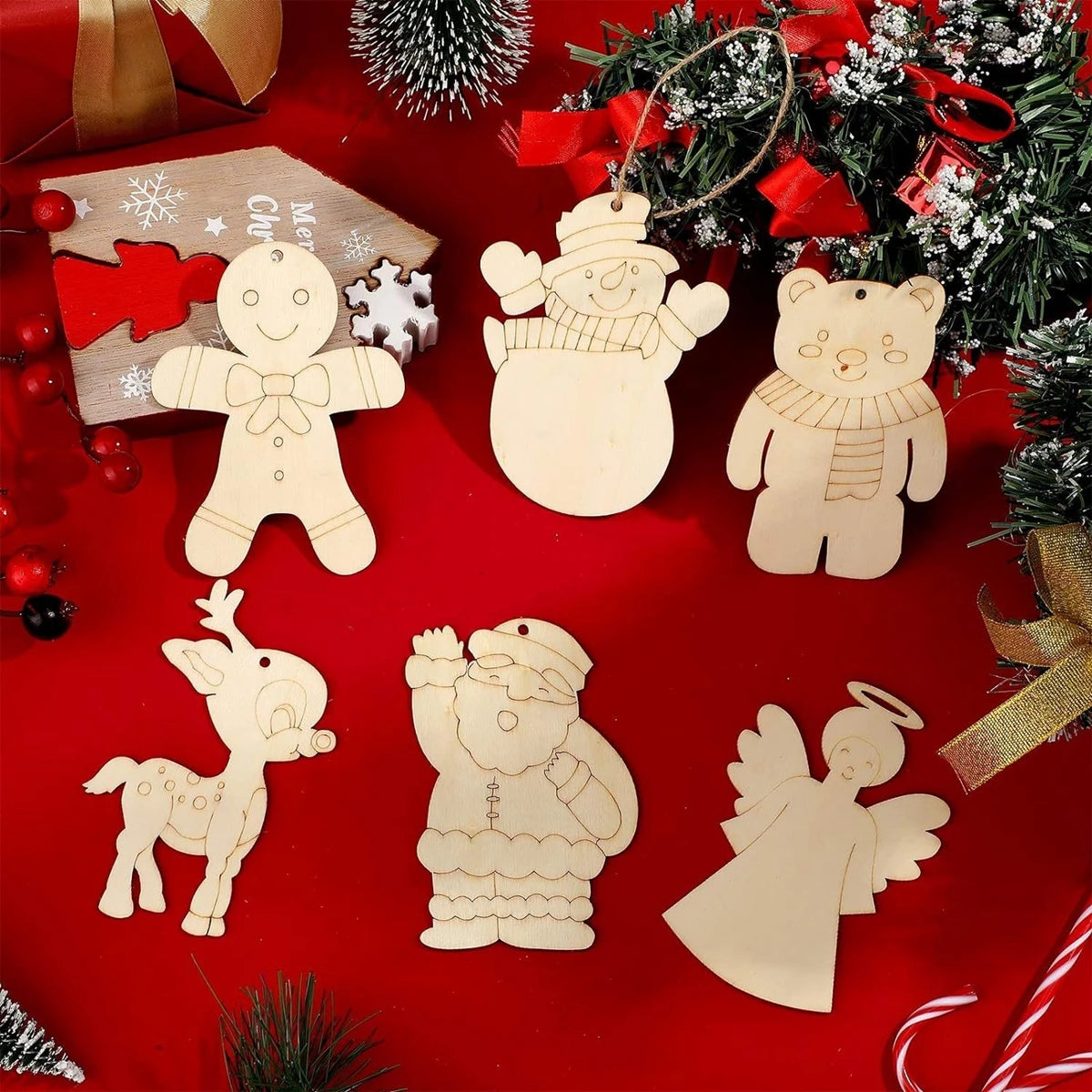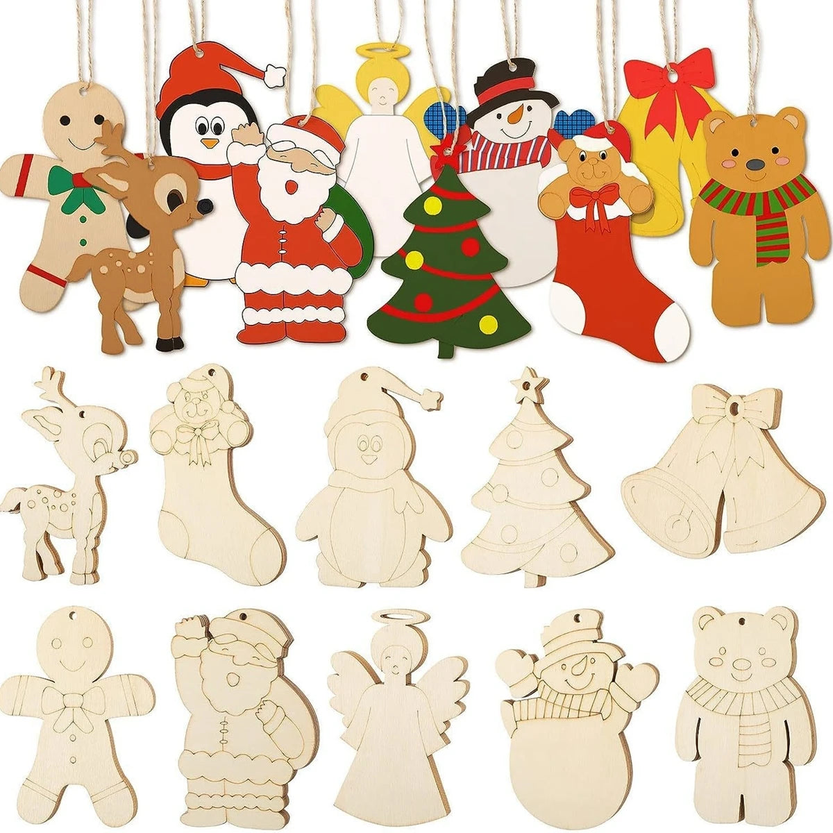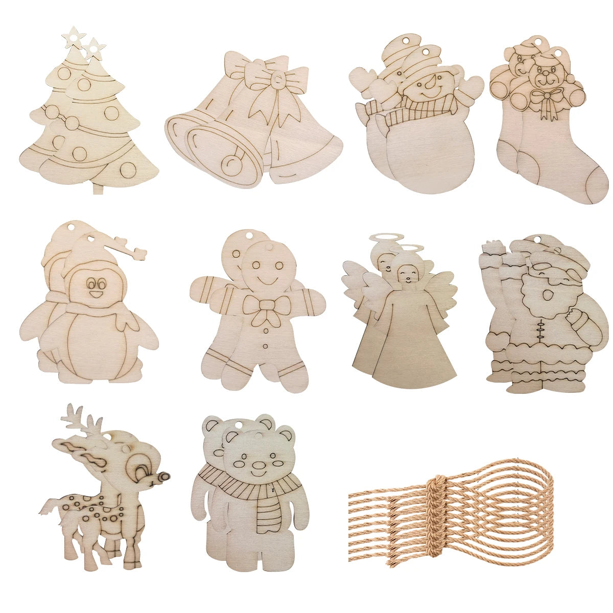 Breng een warme, feestelijke sfeer in huis met deze set van 10 houten kerstornamenten. Elk figuurtje, zoals de kerstman, sneeuwpop of beer, is zorgvuldig uitgesneden uit glad hout en klaar om beschilderd of ingekleurd te worden. Ideaal voor creatieve momenten met kinderen of als originele decoratie voor de kerstboom. Hang ze eenvoudig op met het meegeleverde touwtje en geef je kerstversiering een persoonlijke, handgemaakte uitstraling. Perfect als knutselactiviteit of als uniek cadeau voor de feestdagen.