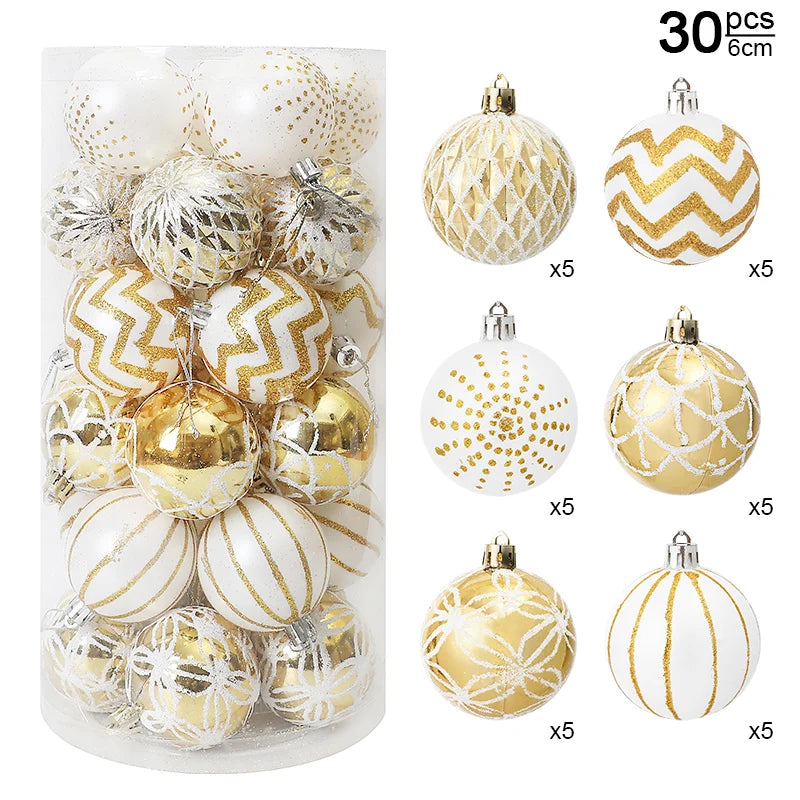 Geef je kerstboom een elegante en luxe uitstraling met deze set van 30 prachtige goud-witte kerstballen van 6 cm. De subtiele glans en combinatie van warme goudtinten met fris wit zorgen voor een feestelijke sfeer die in elk interieur past. Perfect om je boom te vullen of om accenten te leggen.