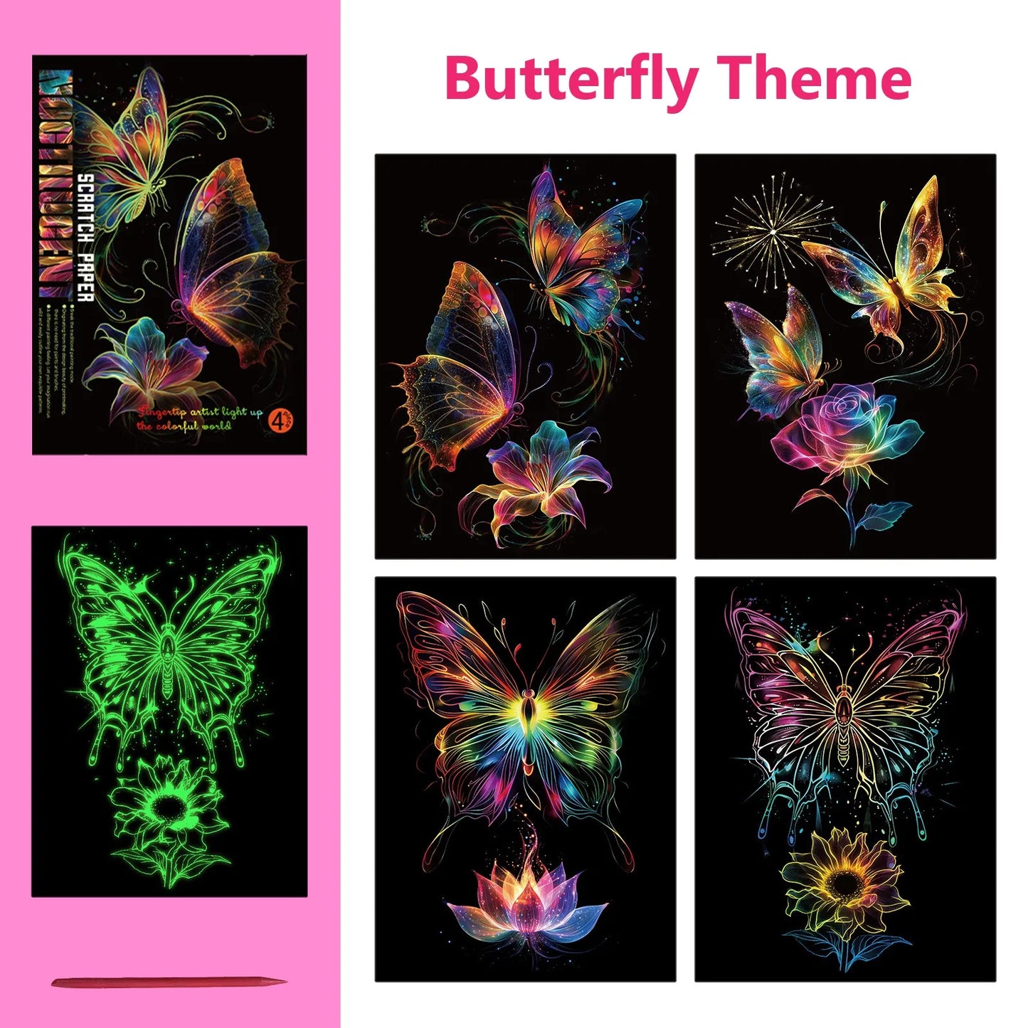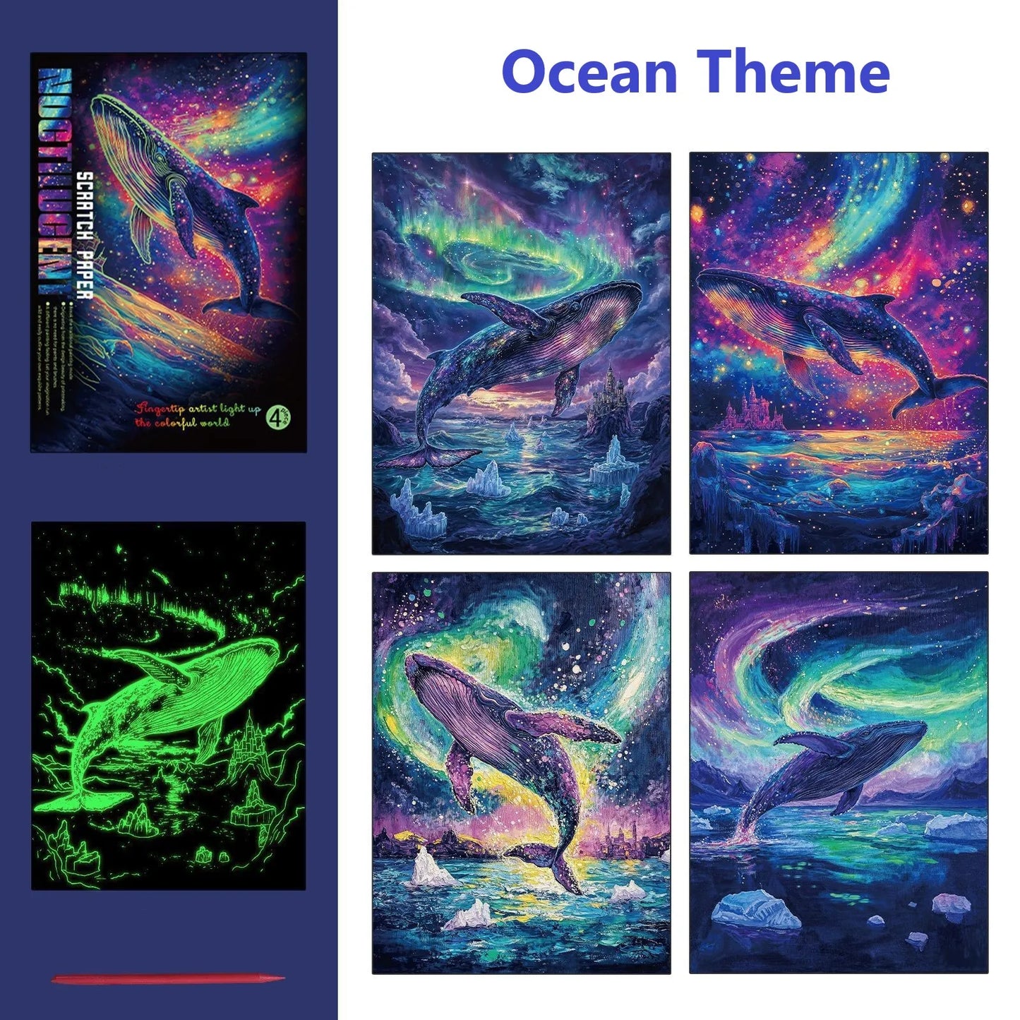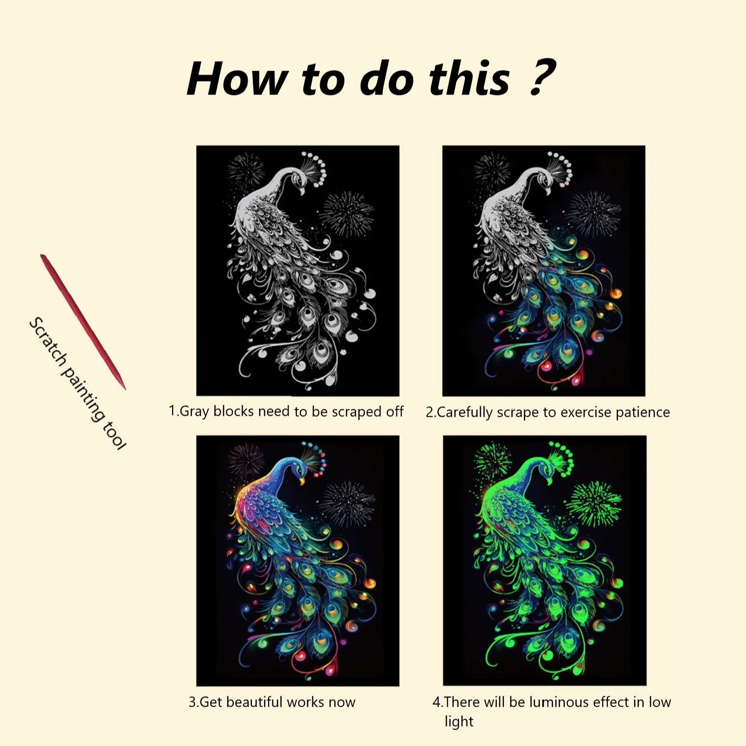 Ontdek de magie van krastekeningen met deze set van 4 Noctilucent regenboog schilderijen. Creëer prachtige kunstwerken door de zwarte laag weg te krassen en kleurrijke ontwerpen te onthullen. De set bevat betoverende afbeeldingen van de oceaan, vlinders en een pauw, perfect voor creatieve geesten van alle leeftijden. Ideaal als cadeau of voor ontspannende knutselmomenten. Laat je creativiteit stralen, zelfs in het donker!