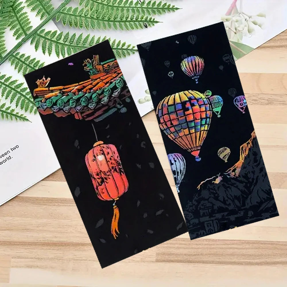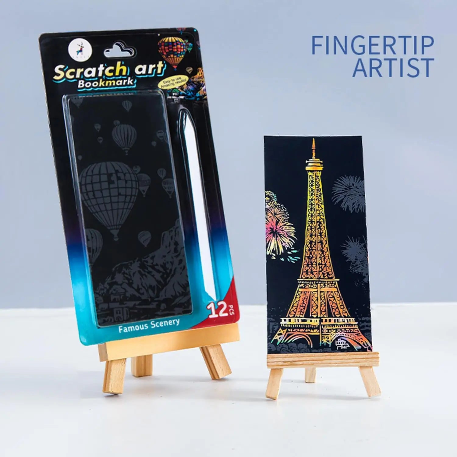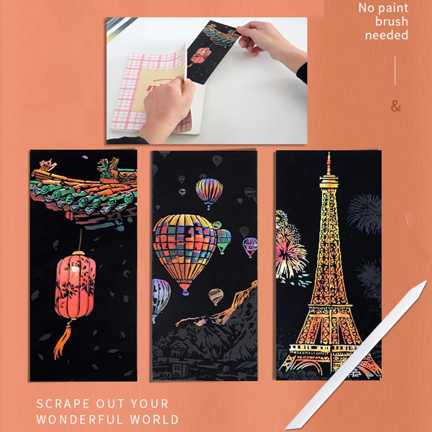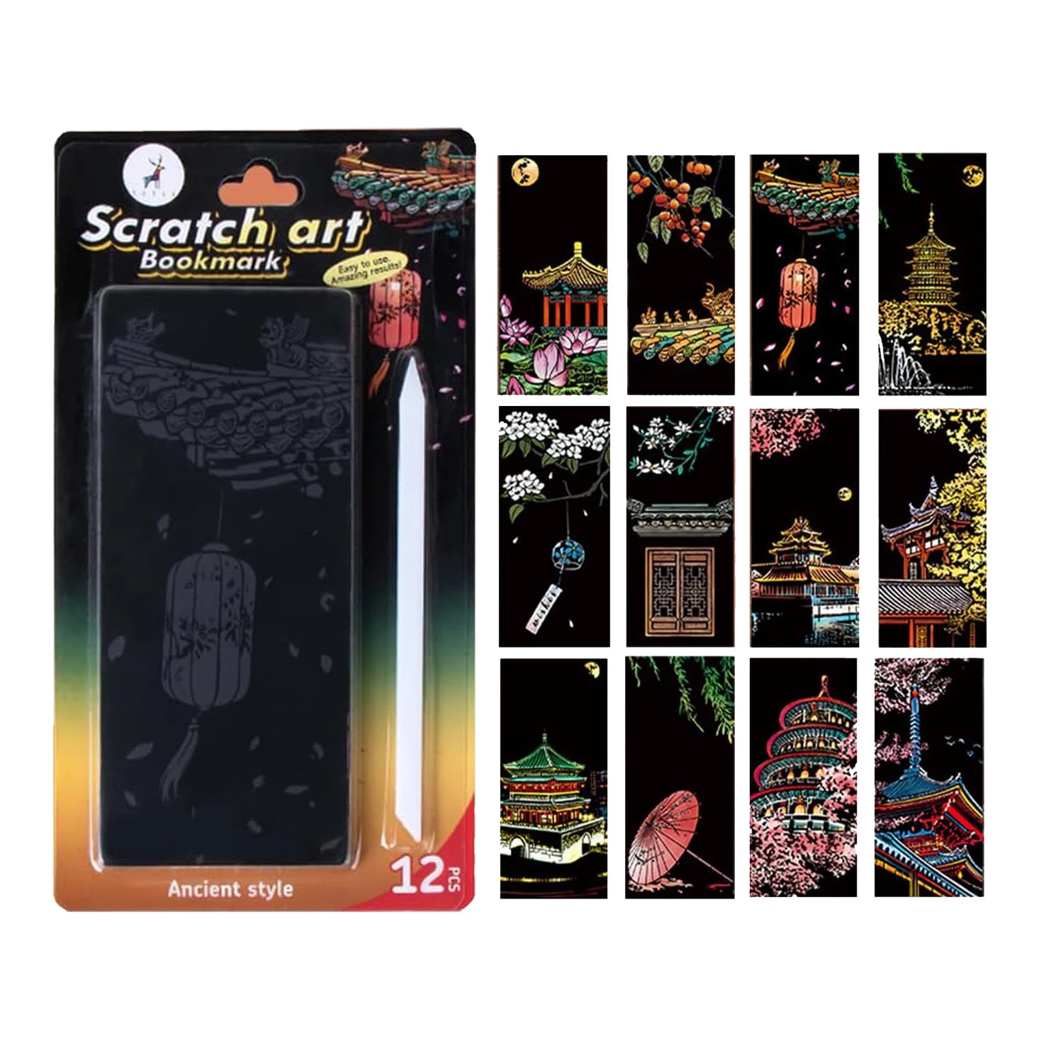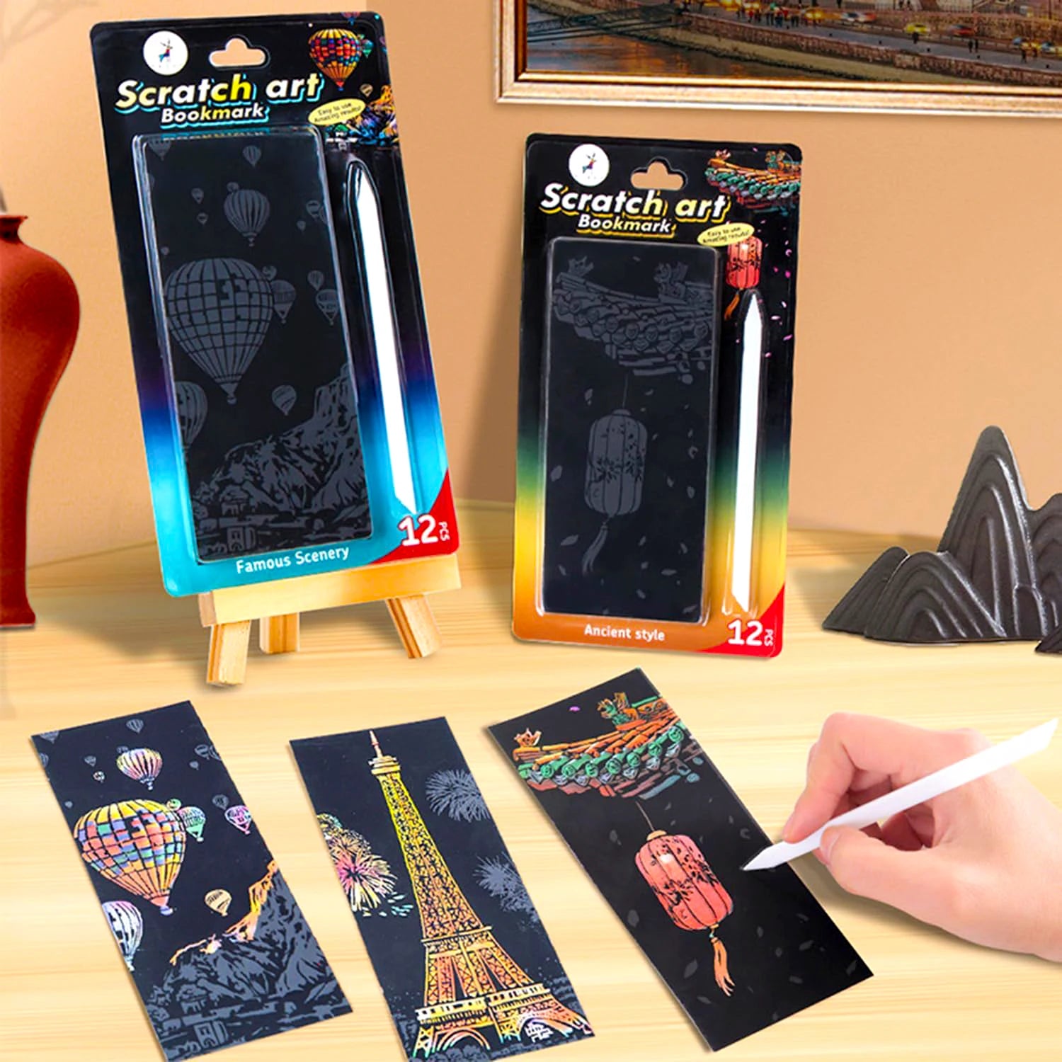 Ontdek de magie van krastekeningen met deze set van 12 unieke boekenleggers! Kras met de meegeleverde kraspen over het grijze oppervlak en onthul kleurrijke regenboogpatronen. De set bevat twee stijlen: wereldberoemde stadsgezichten en een klassieke, historische stijl.