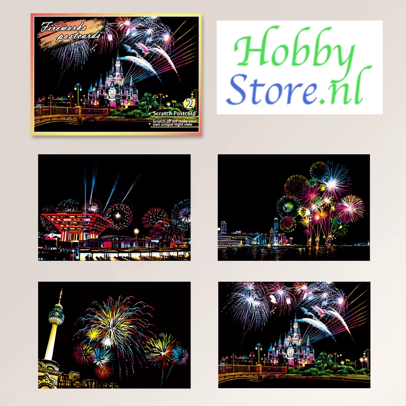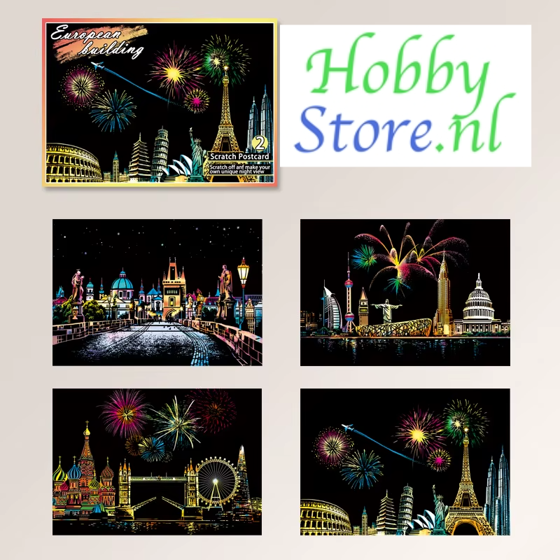 Ontdek de magie van wereldsteden met deze set van 4 krastekeningen met nachtelijke stadsgezichten. Elke tekening onthult een kleurrijk en gedetailleerd landschap wanneer je met de bijgeleverde houten kraspen de bovenste laag wegkrast. De stevige, gecoate krasborden zorgen voor een duurzame en levendige kunstervaring.