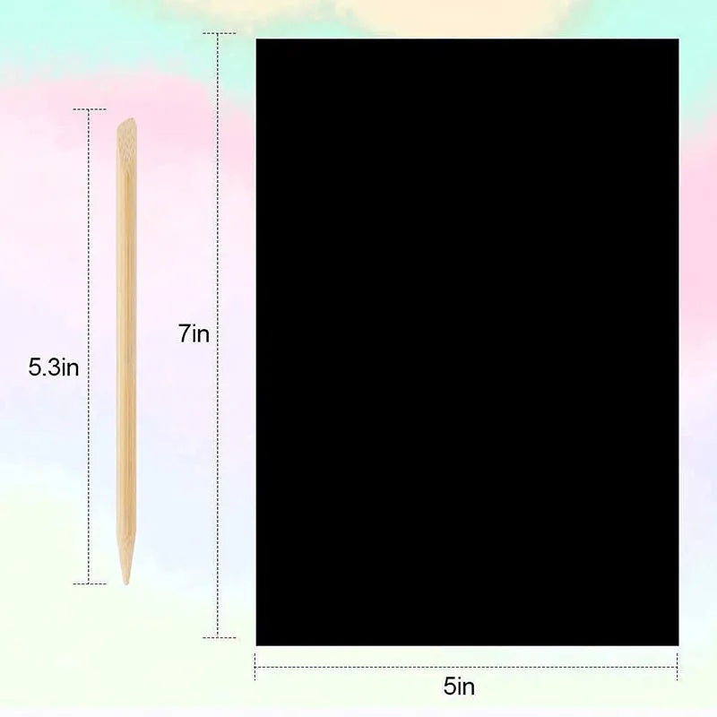 Het stevige papier voorkomt scheuren tijdens het krassen en zorgt ervoor dat je creaties mooi bewaard blijven. De regenboogkleuren onder de zwarte laag zorgen telkens voor een verrassend effect en maken elk kunstwerk uniek. Of je nu kiest voor kleine notities of uitgebreide tekeningen, het resultaat springt altijd in het oog.