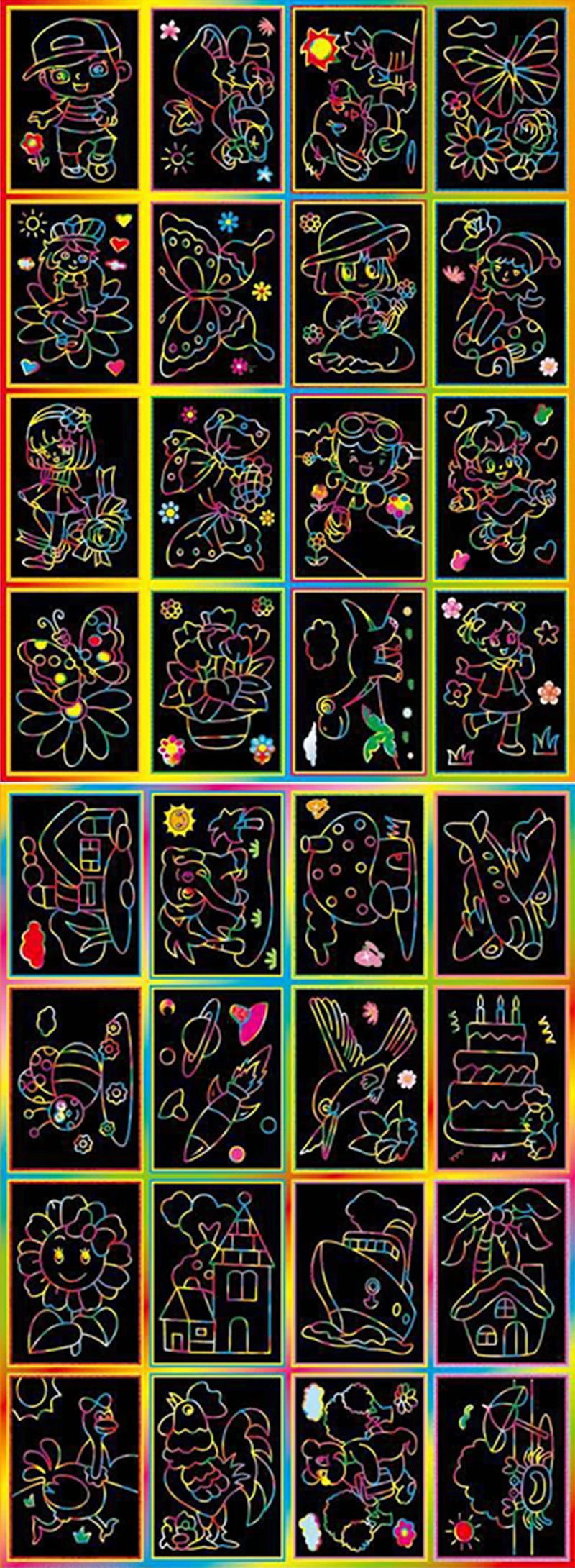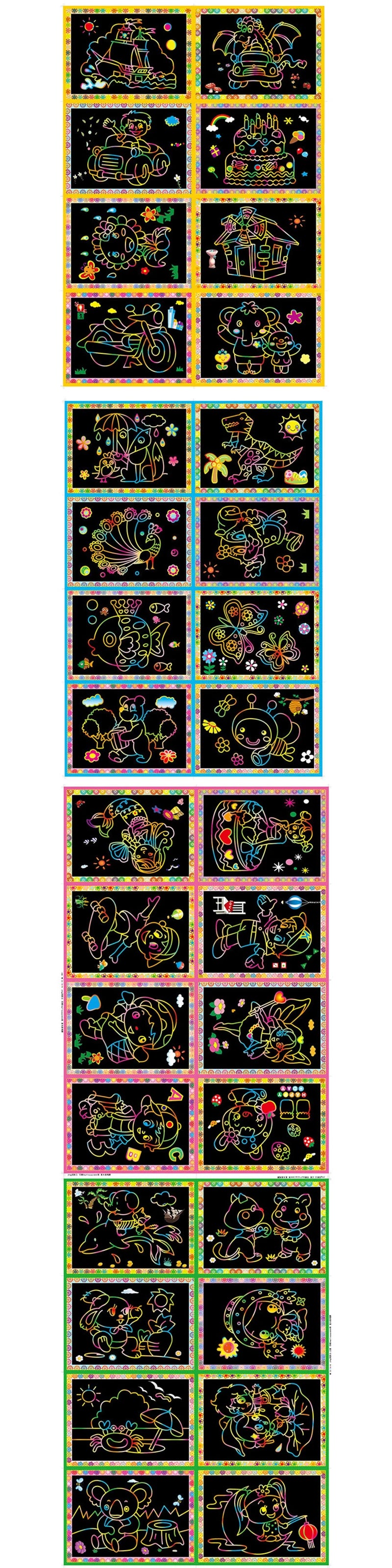 Laat de creativiteit van je kind stralen met deze set van 10 kleurrijke krastekeningen. Elke tekening onthult een schattig cartoonpatroon zodra je kind begint te krassen met het meegeleverde pennetje. Gemaakt van stevig papier en ontworpen voor eindeloos tekenplezier, stimuleren deze doe-het-zelf kunstwerkjes de fijne motoriek, fantasie en concentratie van kinderen vanaf 3 jaar.