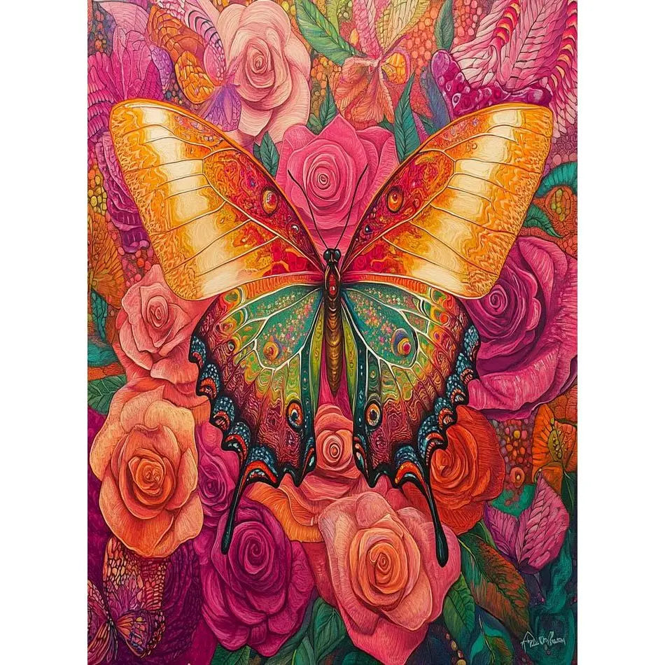 Het schilderij is uitgevoerd met duurzame materialen die zorgen voor heldere kleuren en een langdurig mooi resultaat. De verf dekt gelijkmatig en droogt netjes op, waardoor de vlinder en bloemen een professionele uitstraling krijgen. De meegeleverde lijst zorgt ervoor dat het kunstwerk direct kan worden opgehangen en als moderne wanddecoratie kan dienen.