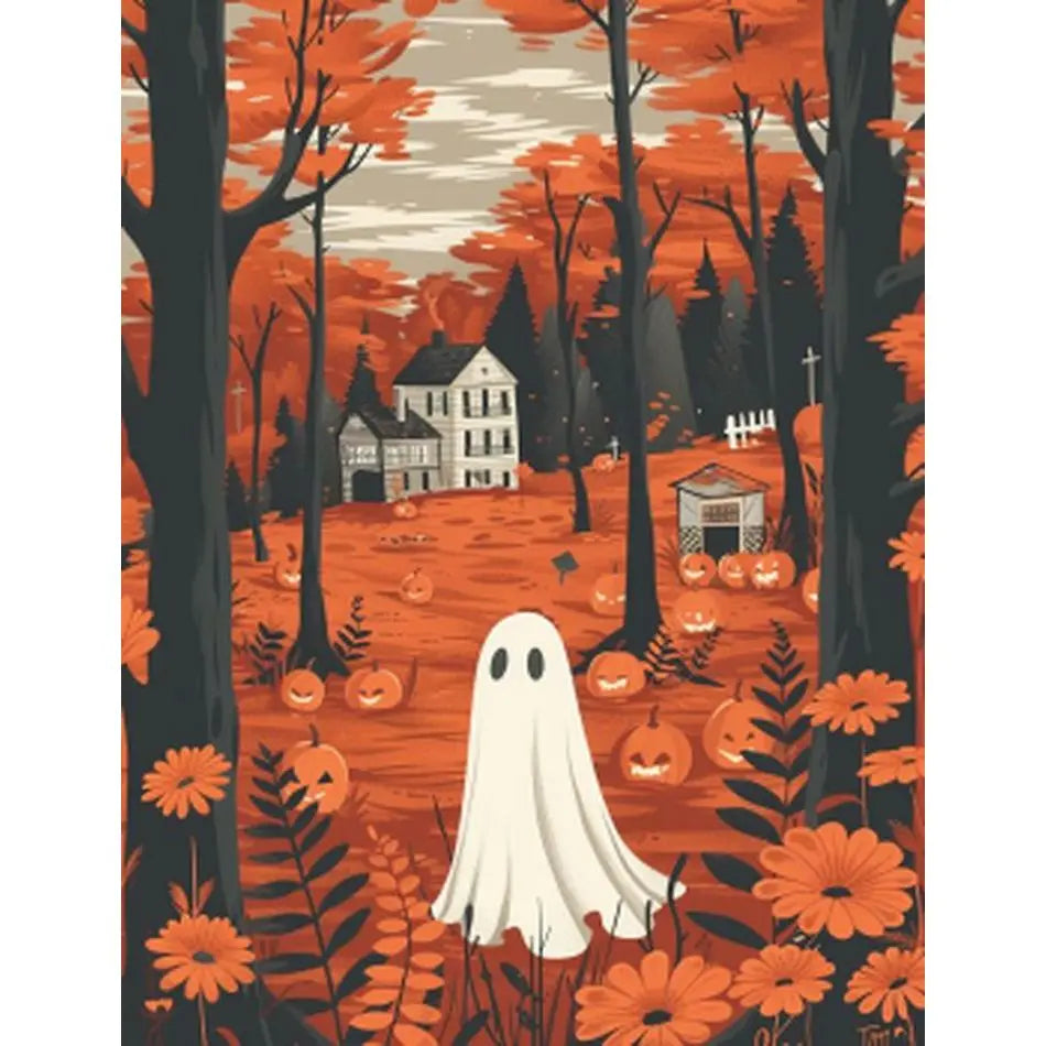 De combinatie van een geheimzinnig bos, speelse geesten en een warme pompoen maakt dit kunstwerk tot een echte blikvanger. Het schilderij sluit naadloos aan bij Halloween decoratie en voegt karakter toe aan elk interieur. Ook als origineel cadeau voor liefhebbers van creativiteit en seizoensdecoratie is dit een uitstekende keuze.