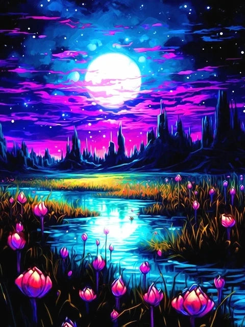Deze schilderen op nummer set met een nachtelijke vijver brengt diepte en sereniteit in elke ruimte. Het kunstwerk toont een stille waterpartij met reflecties en donkere tinten, waardoor een elegante en moderne wanddecoratie ontstaat. De combinatie van zwarte achtergrond en levendige kleurmarkeringen zorgt voor een krachtig contrast en een professioneel ogend resultaat.