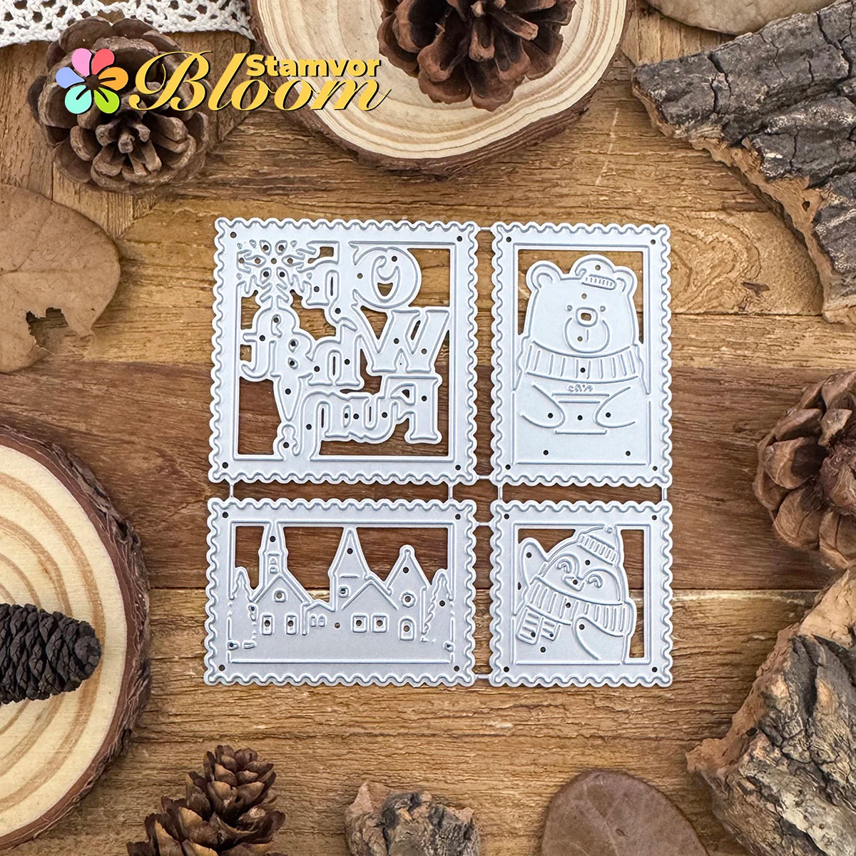 Snijmal kerstbeer en pinguïn dorp met postzegel en frame motieven