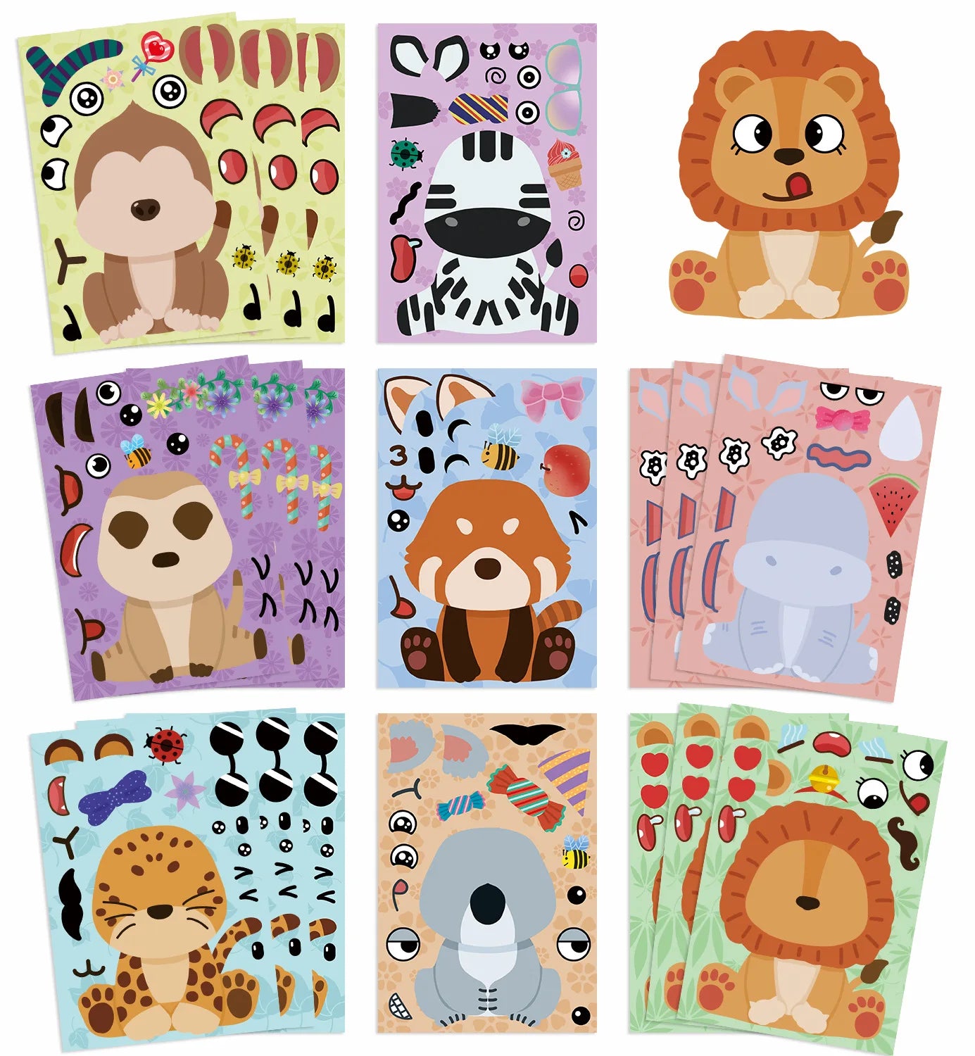 In totaal krijg je acht verschillende stickervellen vol speelse gezichten en dierenonderdelen. Genoeg variatie om elke keer iets nieuws te maken en het spel spannend te houden.
