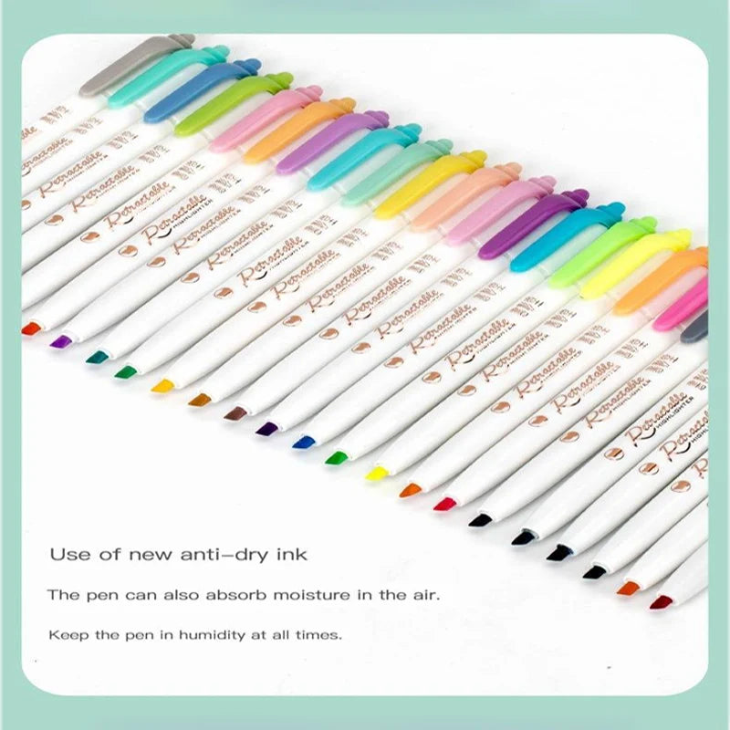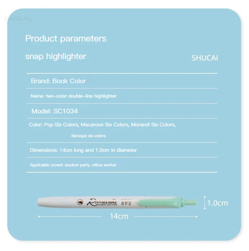 Breng kleur en creativiteit in je notities met deze vrolijke stiften set. De set bestaat uit zes verschillende tinten highlighters met een handige drukknop, waardoor je snel en eenvoudig van kleur wisselt zonder doppen kwijt te raken. De inkt is ontworpen om niet snel uit te drogen, ideaal voor langdurig gebruik. Perfect voor school, bullet journaling of creatieve projecten. Dankzij het compacte ontwerp passen de stiften makkelijk in elke etui of tas. Maak je aantekeningen levendiger en georganiseerder met deze kleurrijke toevoeging aan je schrijfwaren.